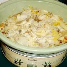 Start by greasing the inside of slow cooker with cooking spray. In a medium bowl mix together shredded cheese onion and ham. In a bowl add 1 can of condensed cream of mushroom soup.