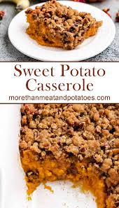 Easy sweet potato casserole from canned yams. Grease a casserole dish. In a medium bowl mix the mashed sweet potatoes white sugar eggs 1 3 cup butter milk and vanilla extract.